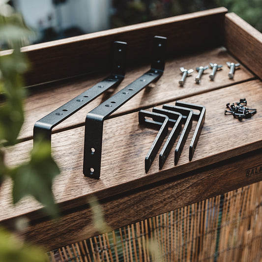 Con il set di staffe Balkonbar puoi decidere tu il tipo di legno e la lunghezza del bancone. In pratica, avrai il tuo Balkonbar su misura. La confezione contiene un set di staffe, materiale per il montaggio e chiare istruzioni per costruire il tuo Balkonbar. Vorresti più banconi uno accanto all'altro? Acquista più set di staffe.